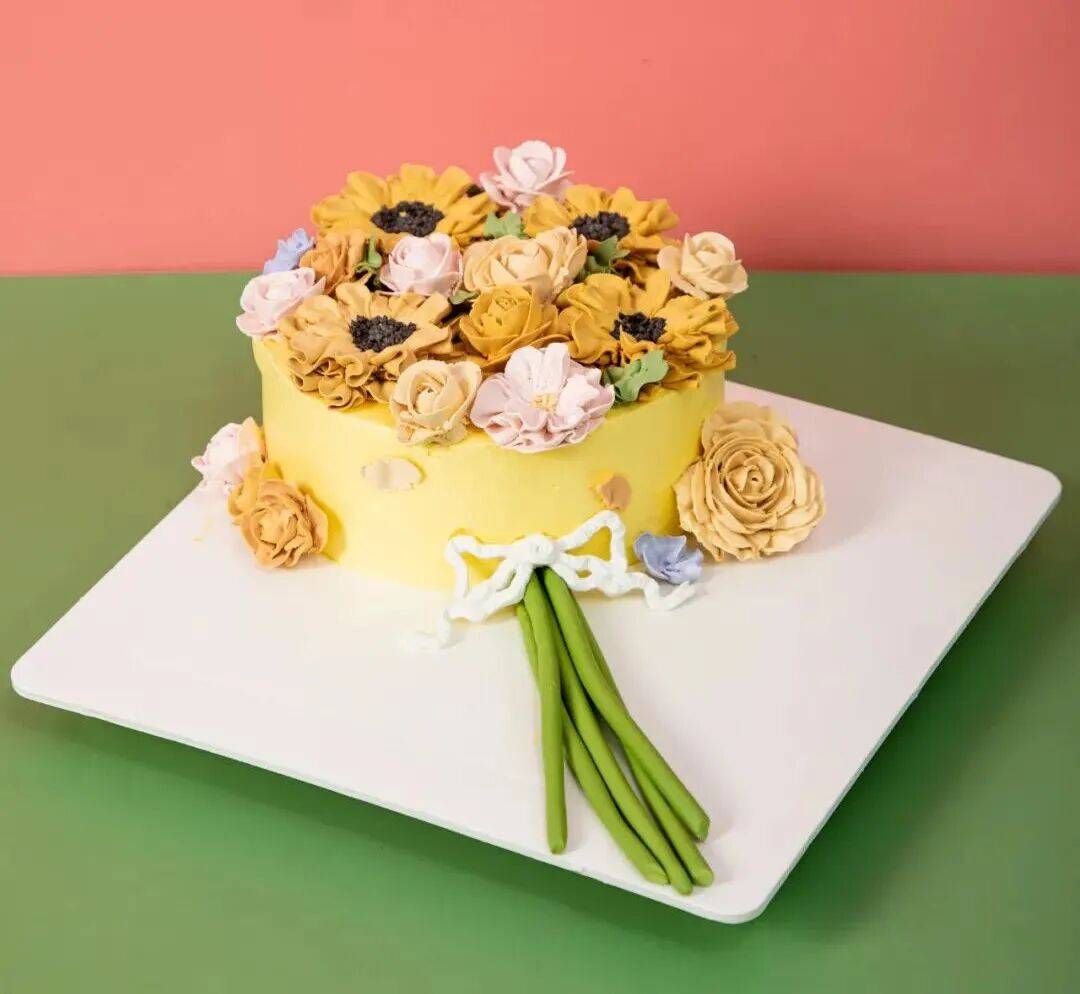 确定中心后,她设思将花朵融入蛋糕创作中,最终确定创制一款向日葵花束蛋糕。蛋糕上装饰了二十余朵韩式裱花,每一朵都磨练着她的耐心与工夫,花枝局部则采用翻糖创制,具体圆满竣工了她的策画构想。
